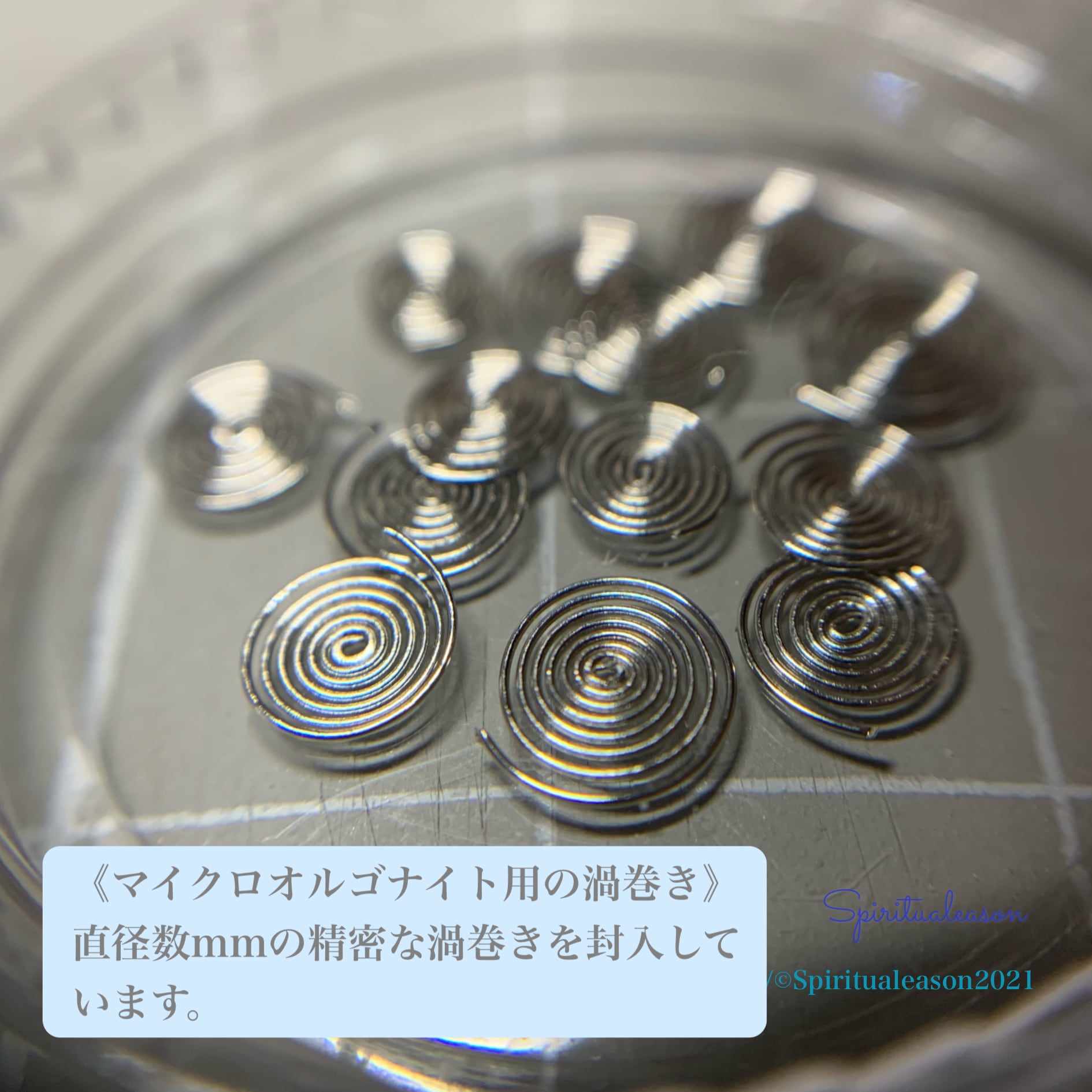 さらに、銅線のワイヤーも渦巻き状にして封入していますので、マイクロオルゴナイト(極小のオルゴナイト)にもなっています。